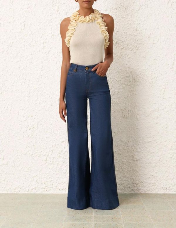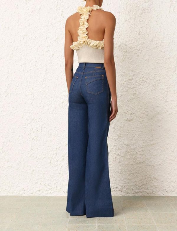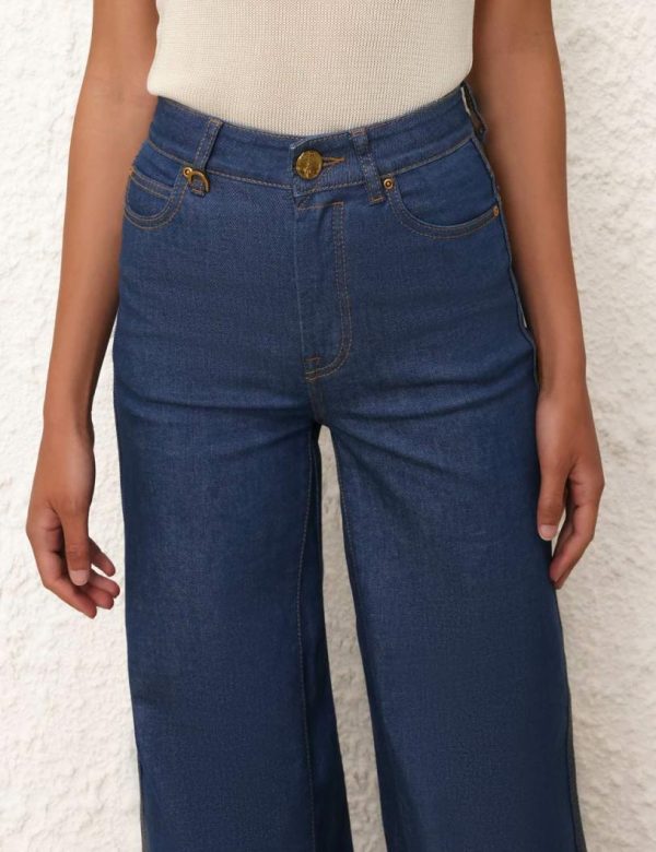 The Matchmaker Palazzo Jean in Railway Blue from our Resort 2024 Collection, Matchmaker. A denim jean featuring and exaggerated wide leg.