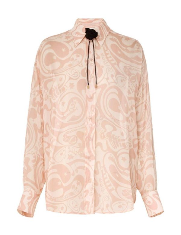 The Matchmaker Relaxed Shirt in Pink/Cream Abstract Musical from our Resort 2024 Collection, Matchmaker. A georgette shirt featuring a classic silhouette, buttons down the centre front and a 3D moulded flower tie.