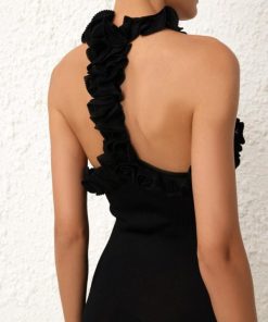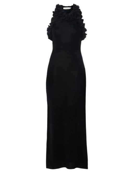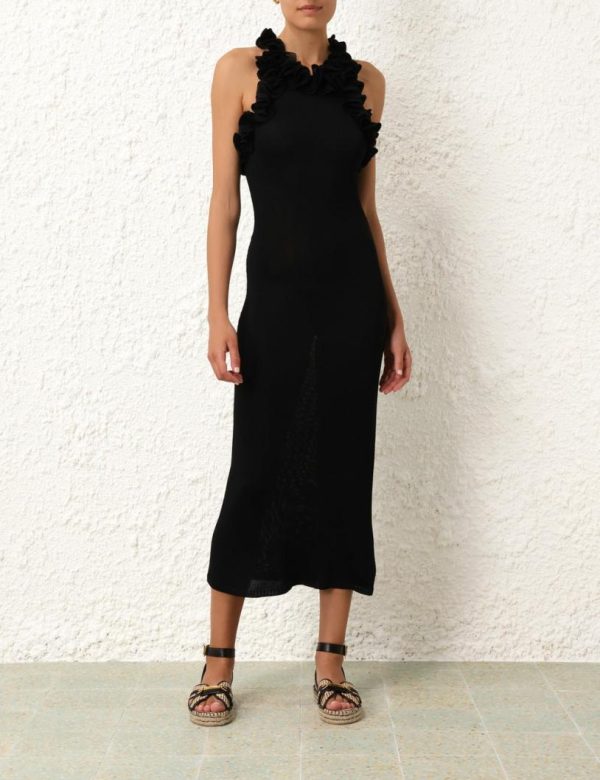 The Matchmaker Ruffle Neck Midi in Black from our Resort 2024 Collection, Matchmaker. A ribbed knit dress featuring a halter neck and statement frill details throughout.