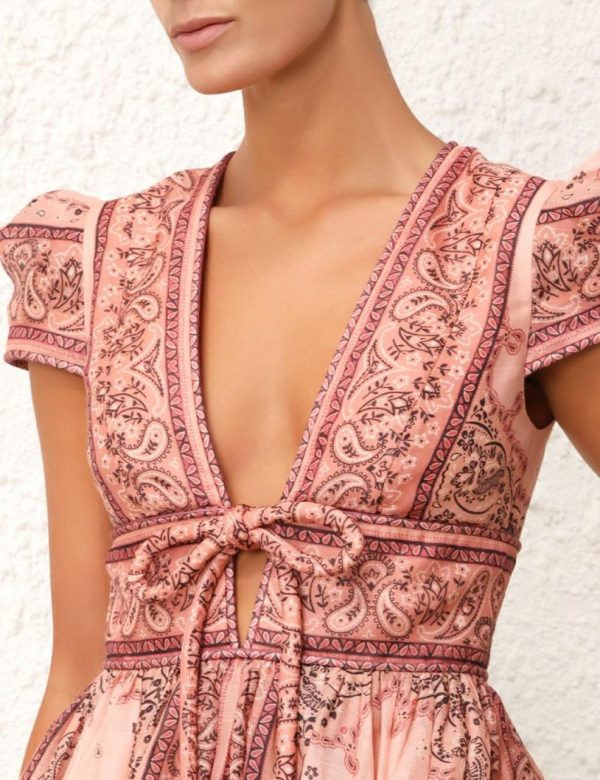 The Matchmaker Structured Mini in Pink Bandana from our Resort 2024 Collection, Matchmaker. A silk linen mini dress featuring a plunging neckline and bow detail, finished with a full mini skirt.