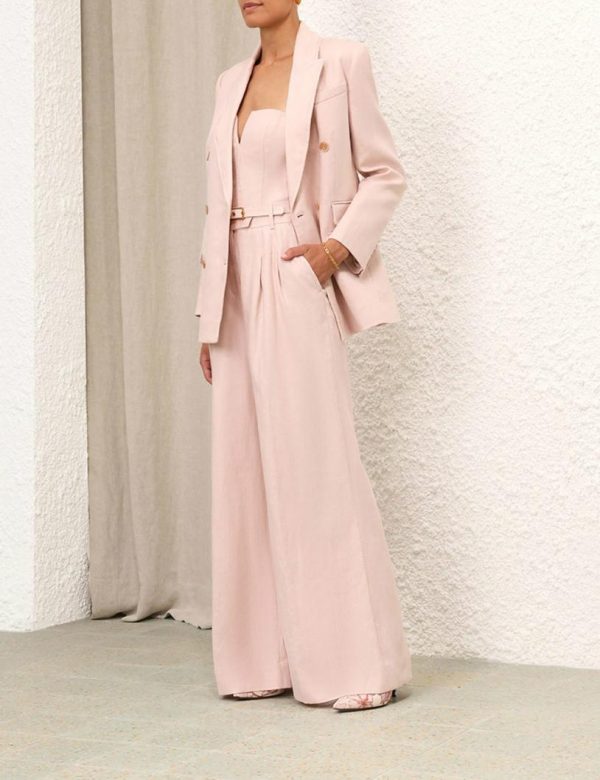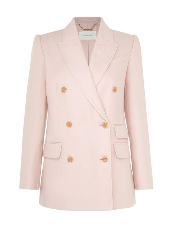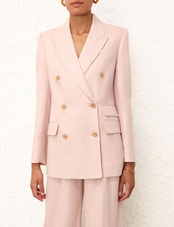 The Matchmaker Tailored Jacket in Blush from our Resort 2024 Collection, Matchmaker. A linen blazer featuring zig zag top stitching throughout, functional pockets with jets, and buttons at the front opening.