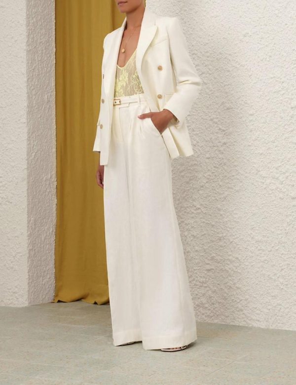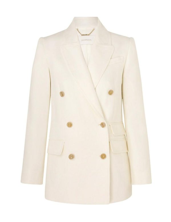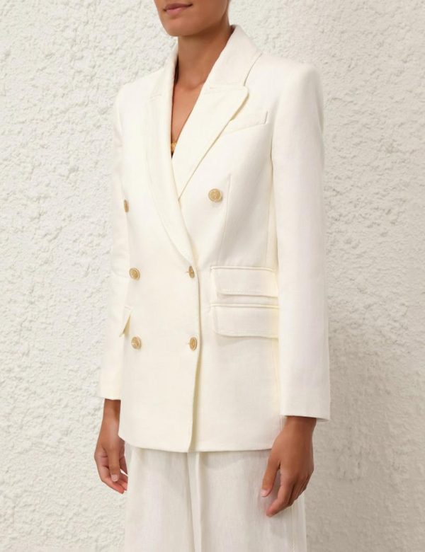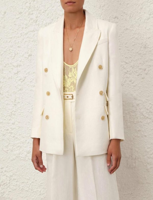 The Matchmaker Tailored Jacket in Ivory from our Resort 2024 Collection, Matchmaker. A linen blazer featuring zig zag top stitching throughout, functional pockets with jets, and buttons at the front opening.
