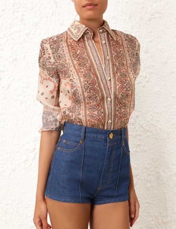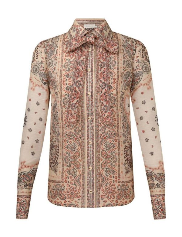The Matchmaker Tie Neck Blouse in Cream Bandana from our Resort 2024 Collection, Matchmaker. A silk linen organza blouse featuring a classic shirt silhouette and self tie neck.