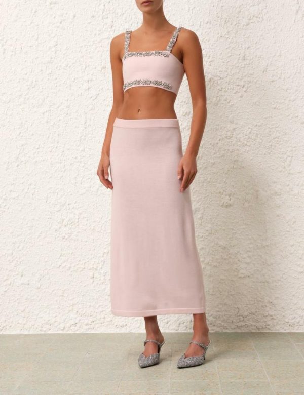 The Matchmaker Tube Skirt in Dusty Pink from our Resort 2024 Collection, Matchmaker. A merino wool midi skirt featuring an elastic waistband.
