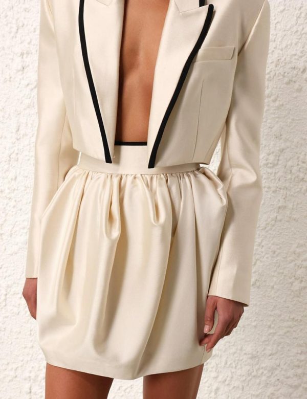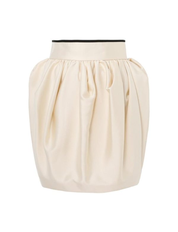 The Matchmaker Tulip Mini Skirt in Cream from our Resort 2024 Collection, Matchmaker. A wool and silk blend mini skirt featuring a high waist and tulip silhouette.
