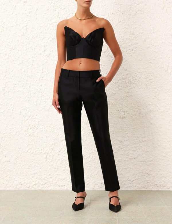 The Matchmaker Tuxedo Pant in Black from our Resort 2024 Collection, Matchmaker. A silk wool pant featuring side seam front pockets and belt loops.