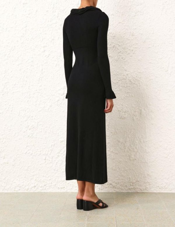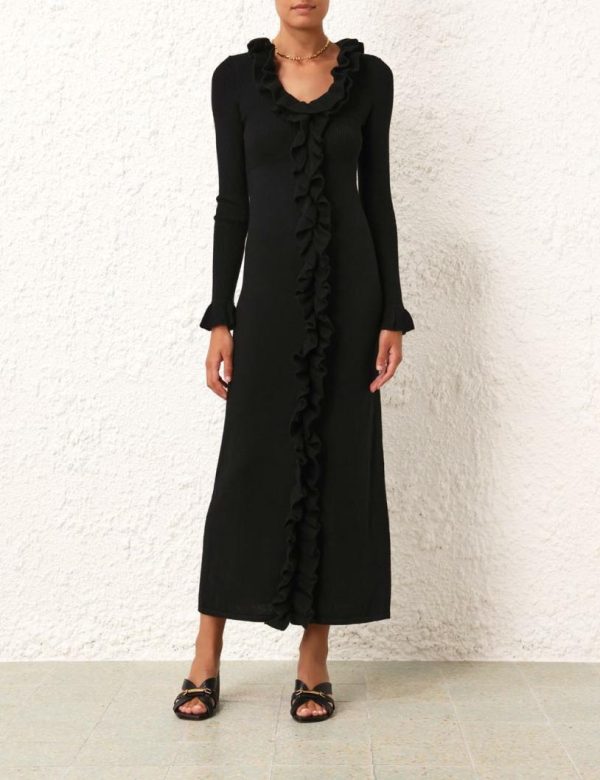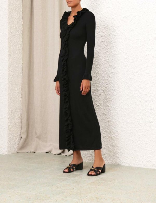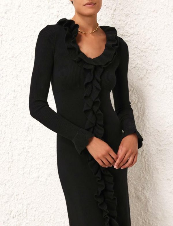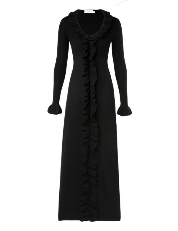 The Matchmaker V-Neck Ruffle Dress in Black from our Resort 2024 Collection, Matchmaker. A wool midi dress featuring long sleeves with fluted cuffs and ruffle details throughout.