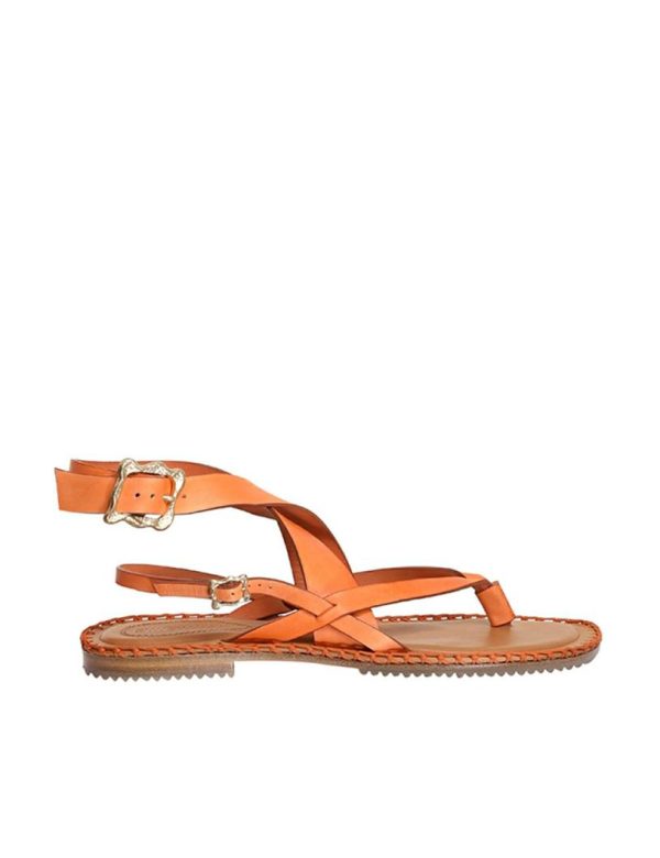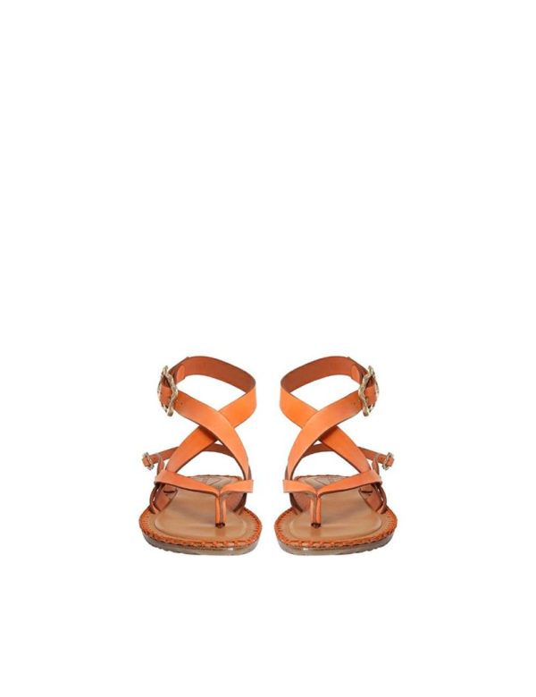 The Multi-Strap Sandal Flat in Orange from our Summer Swim 2023 Collection. A flat thong sandal featuring leather straps and contrast artisan stitching throughout.