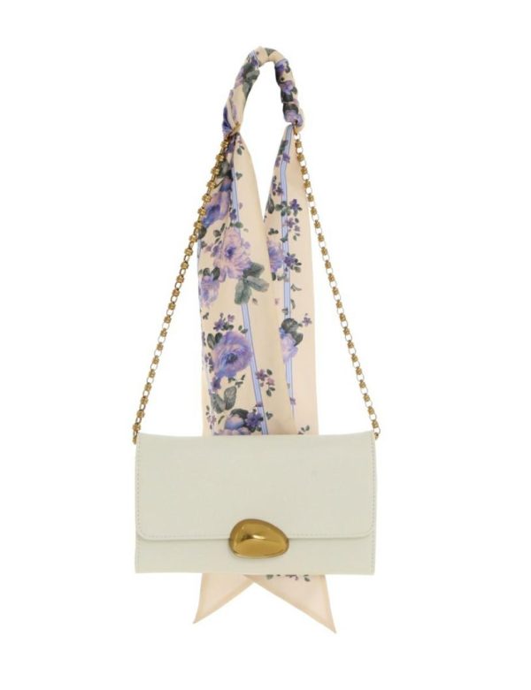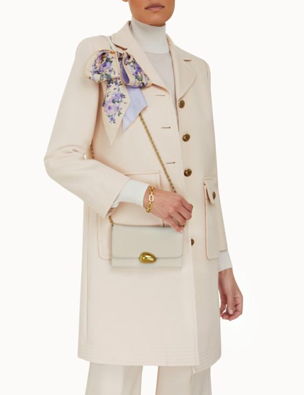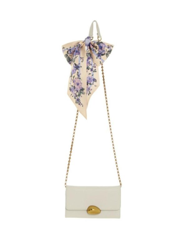 The Pebble Evening Mini Chain Bag in Cream from our Fall 2023 Collection, Luminosity. A leather cross body bag featuring internal card pockets and a gold chain strap, finished with a silk patterned scarf tie.