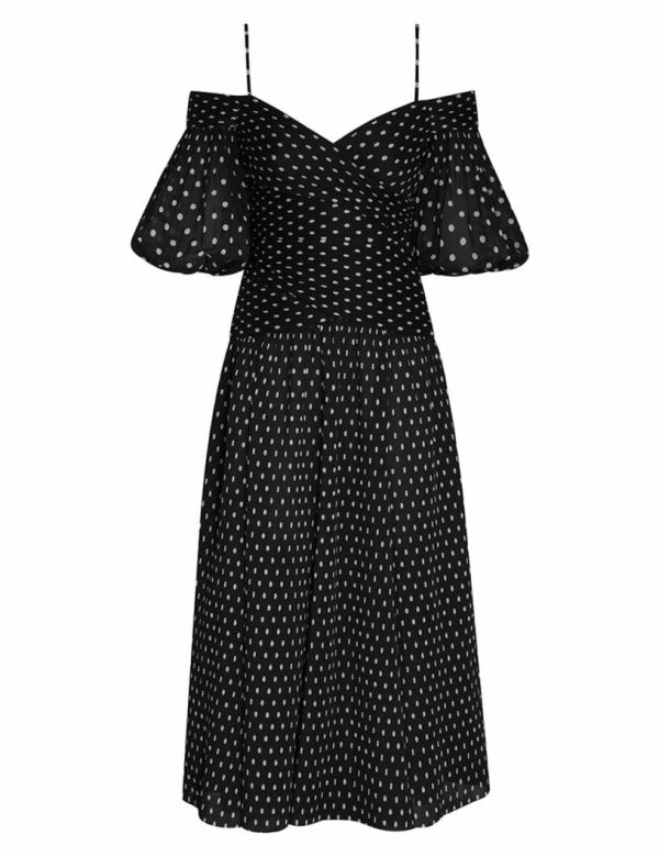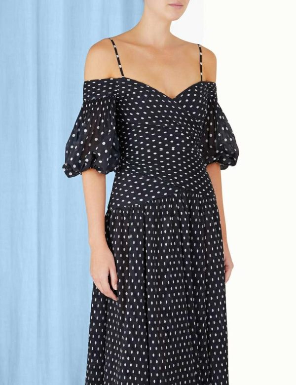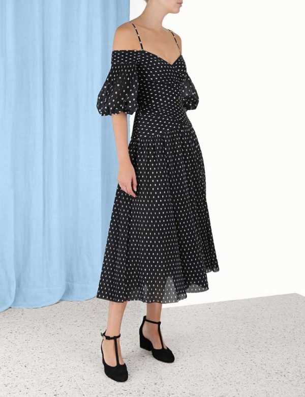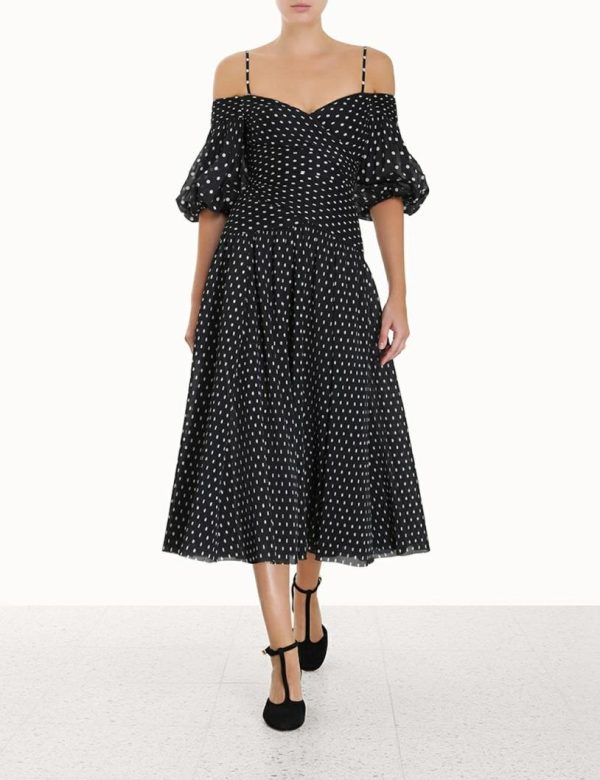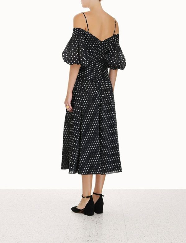 The Pleated Midi in Black/Cream Dot from our Fall 2023 Collection, Luminosity. A pleated midi dress featuring a laser cut hem, ruching throughout, and a grosgrain internal ribbon across back waist to create structure.