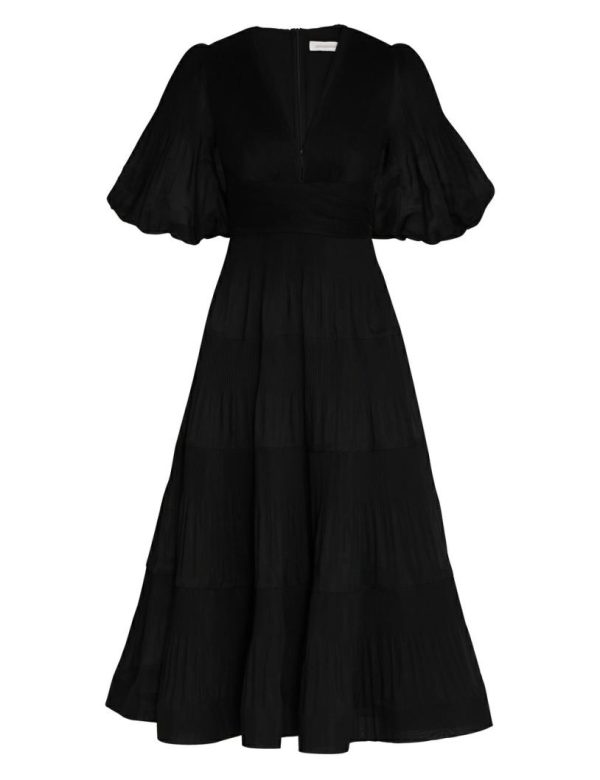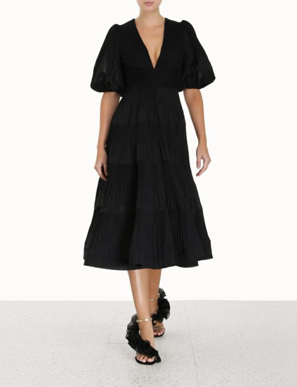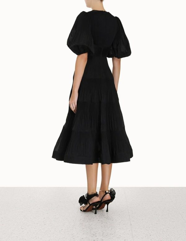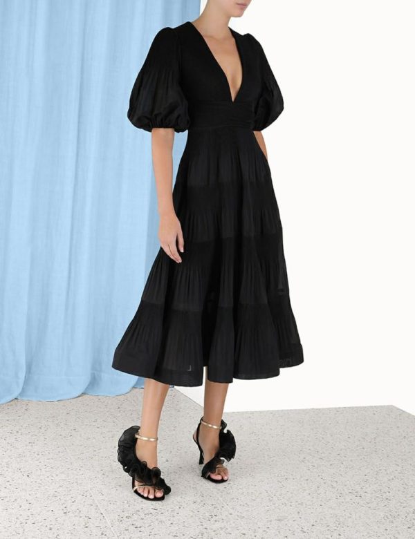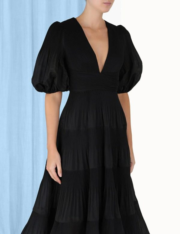 The Pleated Midi Dress in Black from our Fall 2023 Collection, Luminosity. A midi dress that gathers under the bust and falls to a crinoline inserted hem.