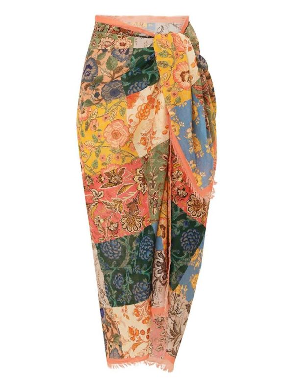 The Printed Cotton Pareo in Patch Floral from our Resort 2024 Collection, Matchmaker. A large rectangle pareo featuring frayed edges and a placement print throughout.