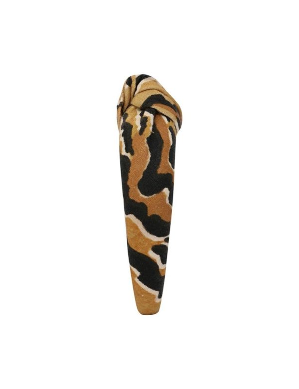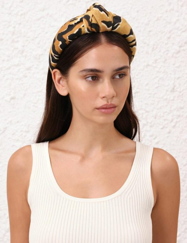 The Printed Linen Headband in Tan Tiger from our Resort 2024 Collection, Matchmaker. A headband featuring a top knot detail.
