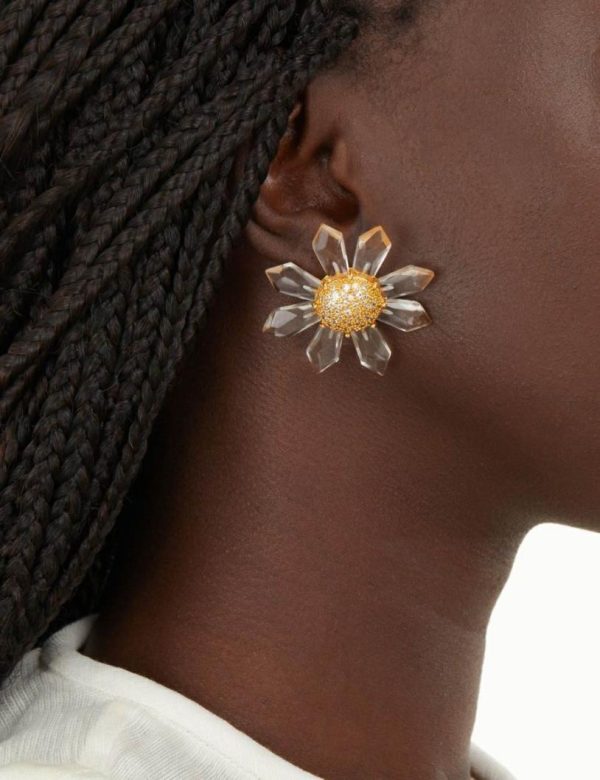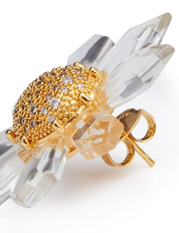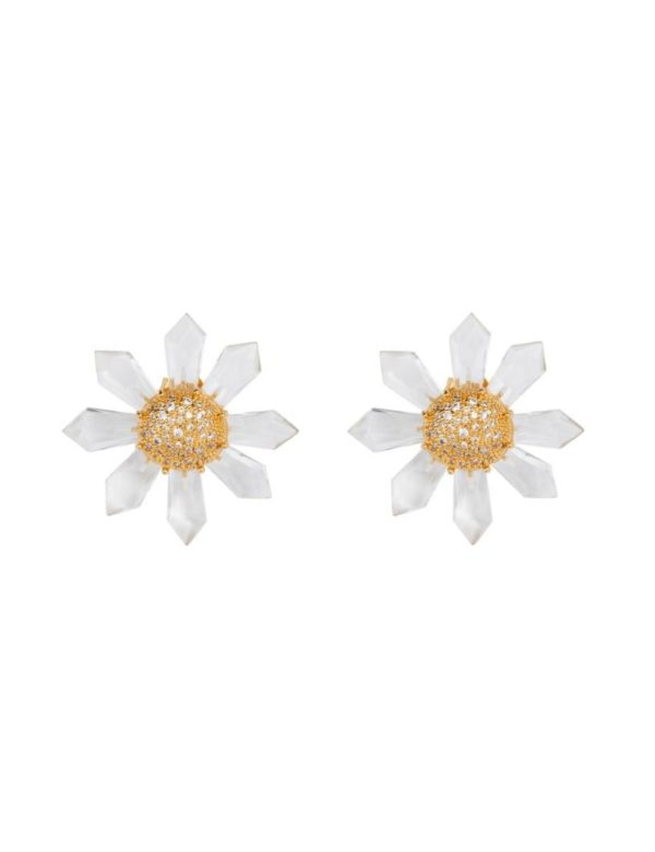 The Quartz Sunflower Earrings in Gold/Quartz from our Spring 2023 Collection, Wonderland. Gold plated sunflower shaped earrings featuring cubic zirconia stones and natural quartz.