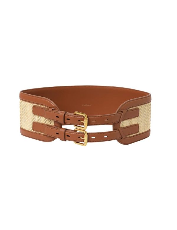 The Raffia Belt 90 in Avalon from our Resort 2024 Collection, Matchmaker. A wide leather belt featuring a double buckle and contrast raffia throughout.