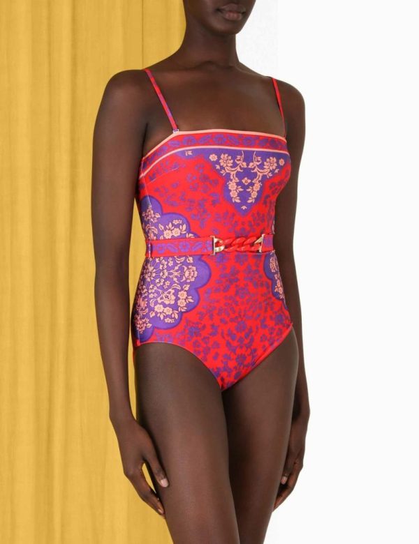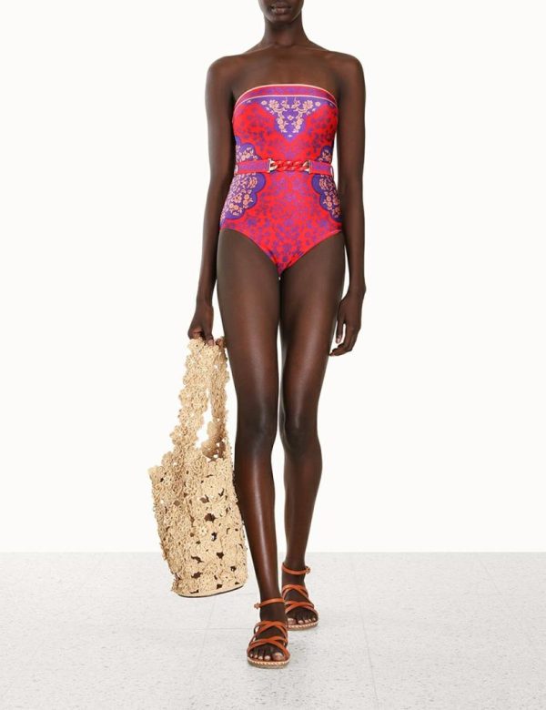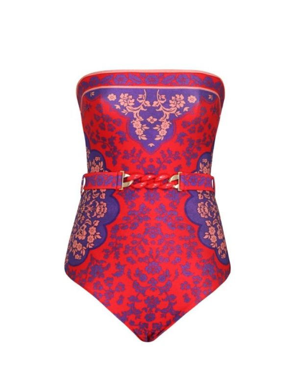 The Raie Chain Link Bandeau 1PC in Purple/Red Floral from our Summer Swim 2023 Collection. A lycra one piece featuring a chain link removable belt and removable straps.