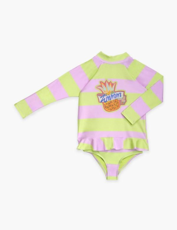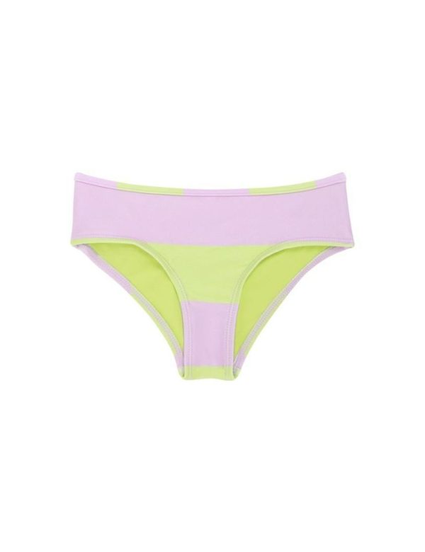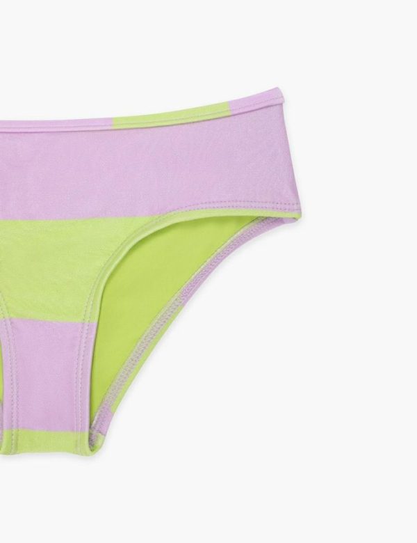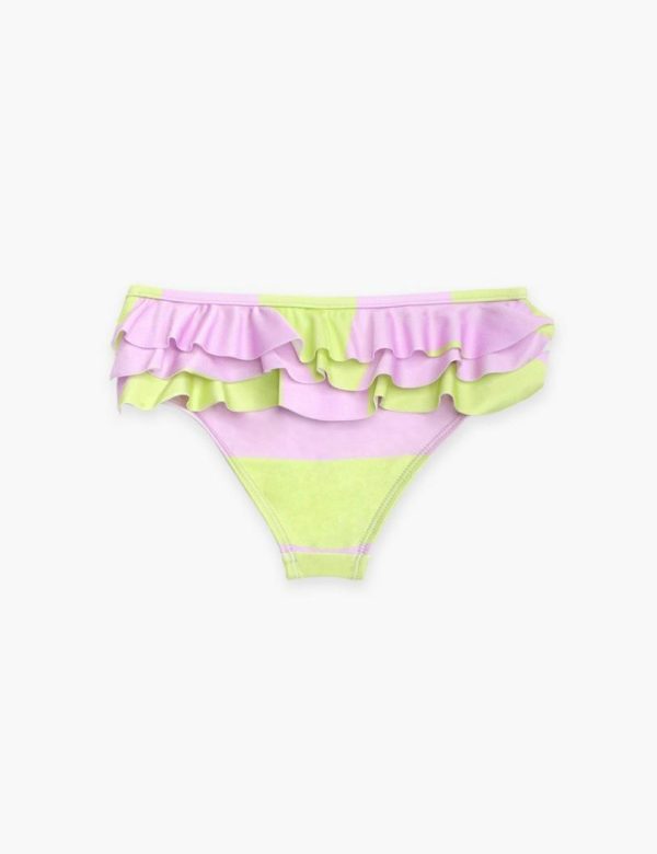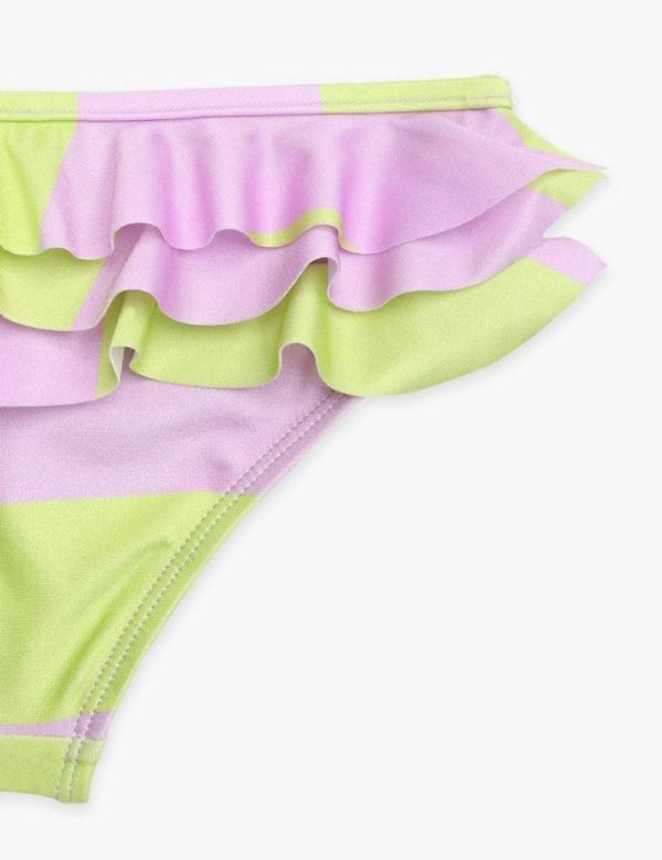 The Raie Frill Pant in Green/Lilac from our Summer Swim 2023 Collection. An Italian lycra bikini bottom with a triple frill detail at back.