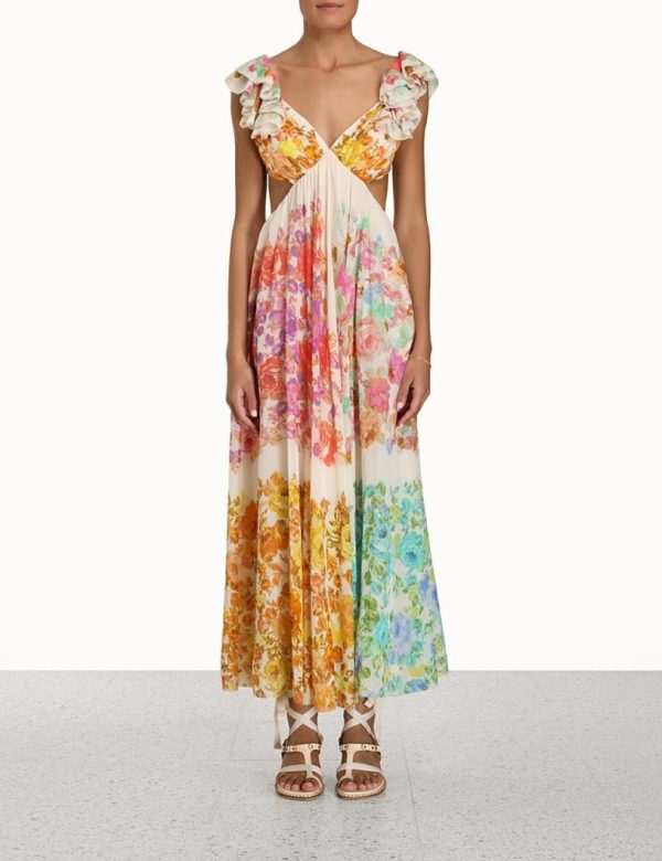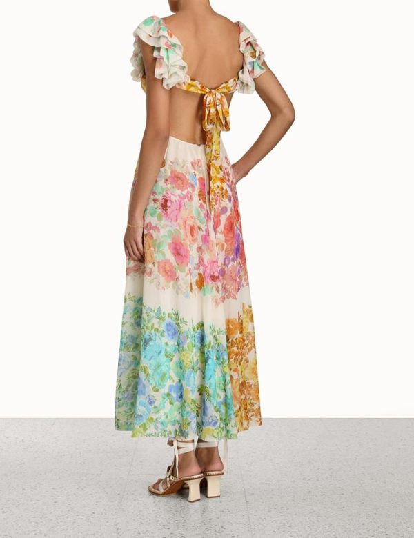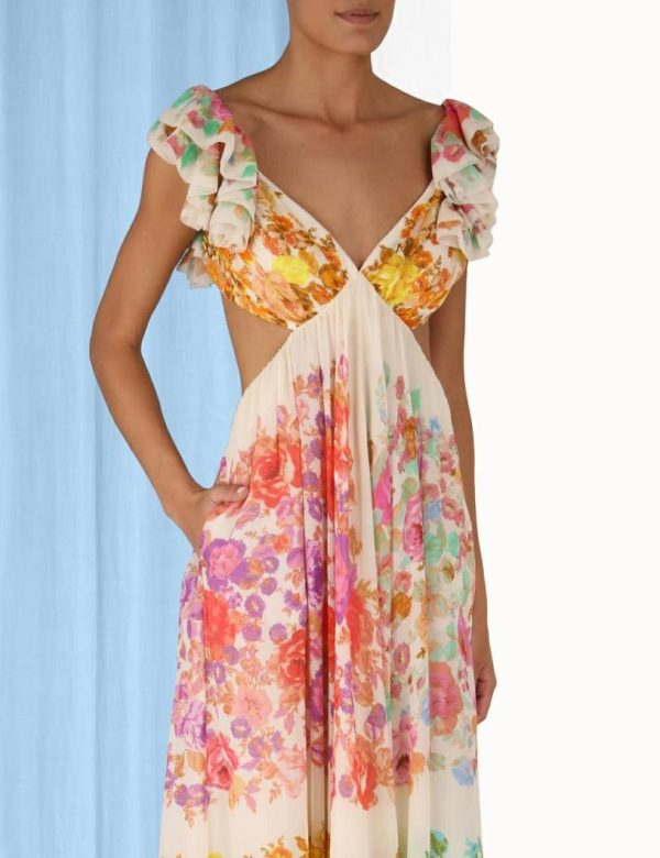 The Raie Frill Shoulder Midi Dress in Multi Floral from our Summer Swim 2023 Collection. A cotton silk midi dress featuring ruffled shoulders, waist cut outs, a self tie back, and placement print.
