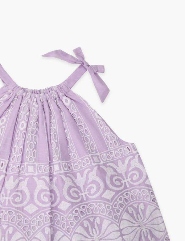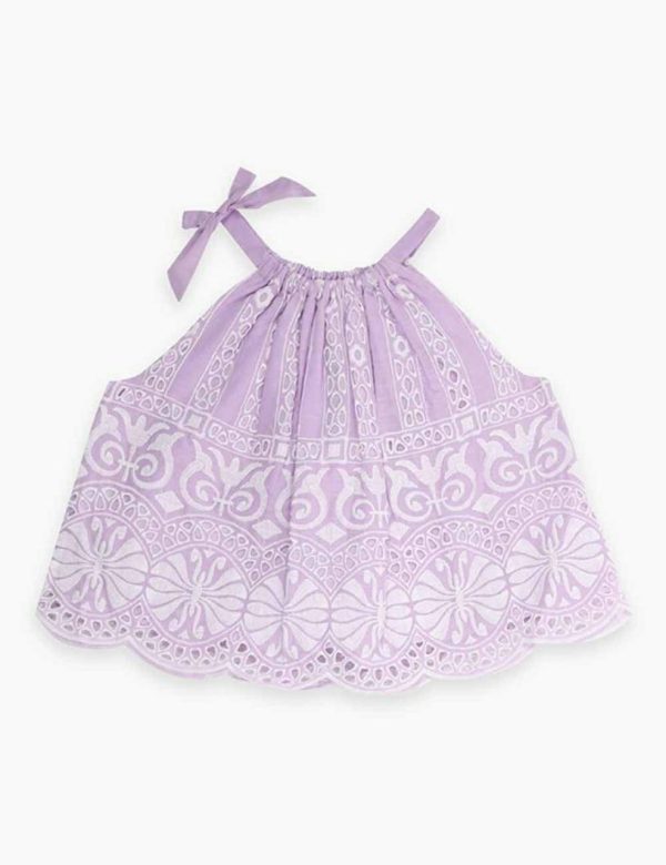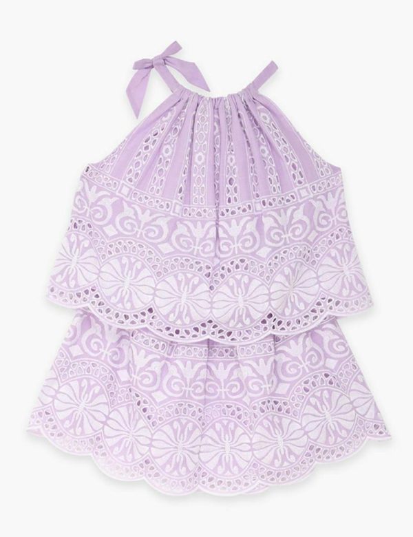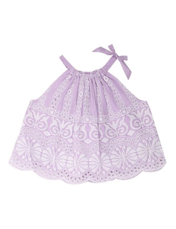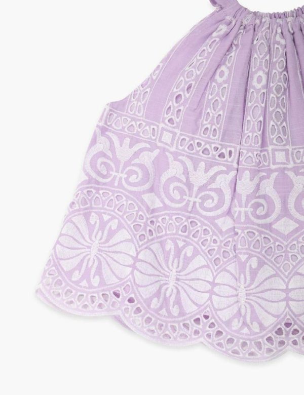 The Raie Halter Top in Lilac from our Summer Swim 2023 Collection. A cotton top featuring embroidery throughout and a scalloped hemline.