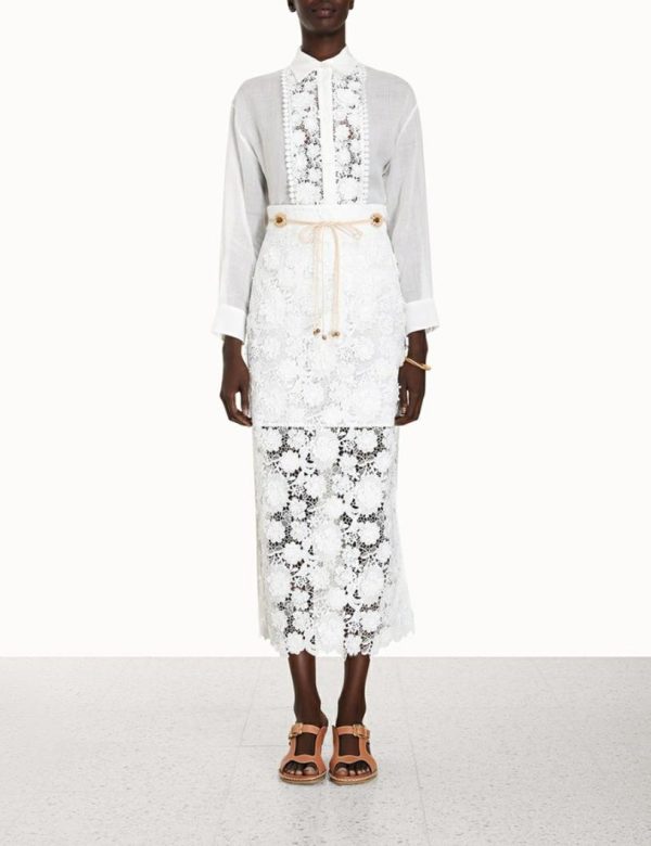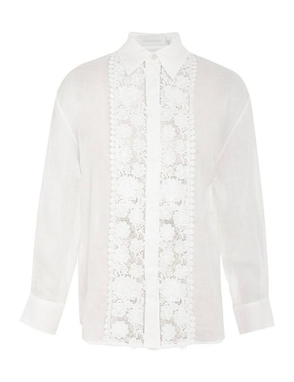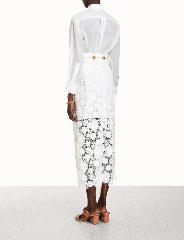 The Raie Lace Flower Shirt in Ivory from our Summer Swim 2023 Collection. A ramie long sleeve shirt featuring a 3D flower insert lace trim.