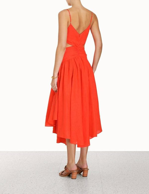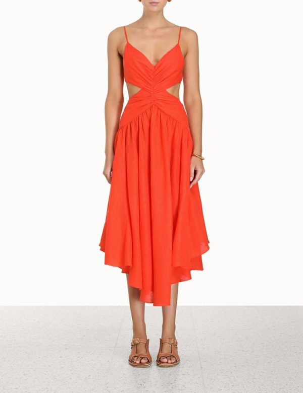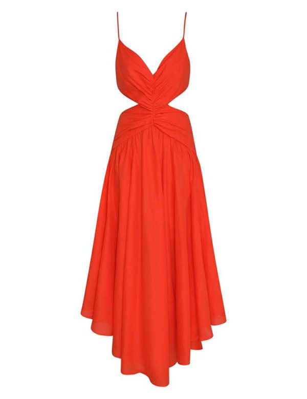 The Raie Plunge Cut Out Midi Dress in Tangerine from our Summer Swim 2023 Collection. A linen midi dress featuring a plunging neckline, invisible zip at the centre back, adjustable straps, and gathering throughout bodice.