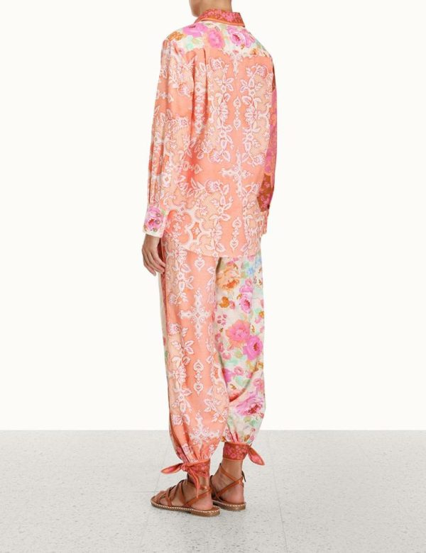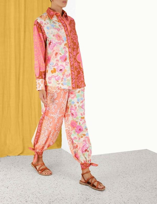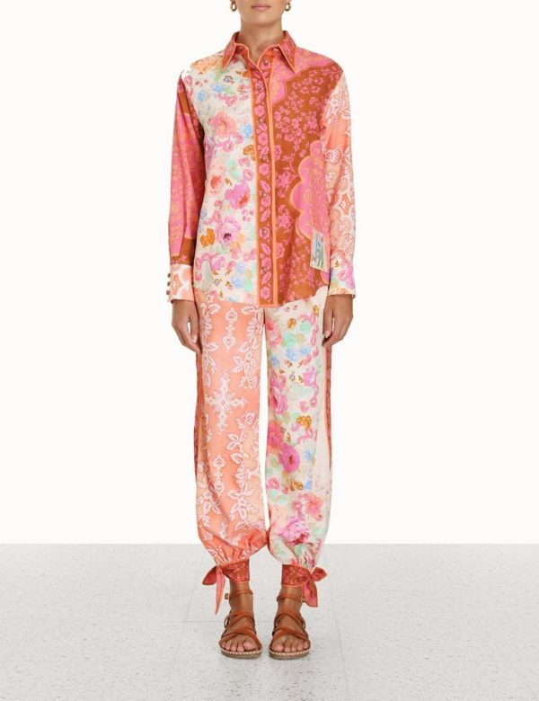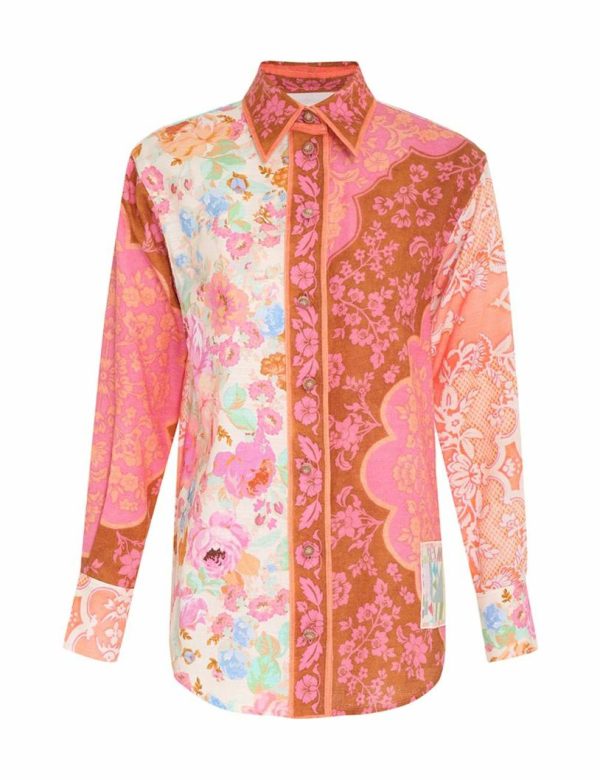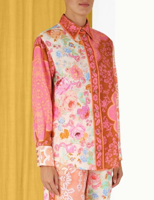 The Raie Spliced Body Shirt in Multi Floral from our Summer Swim 2023 Collection. A cotton long sleeve shirt featuring a contrast border placket, two tone crochet buttons and a patch on the left bottom hem.