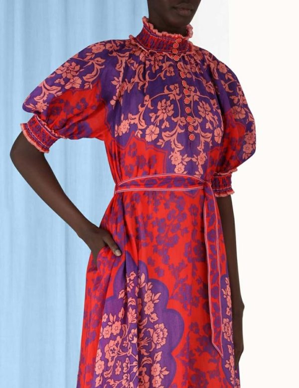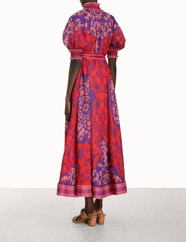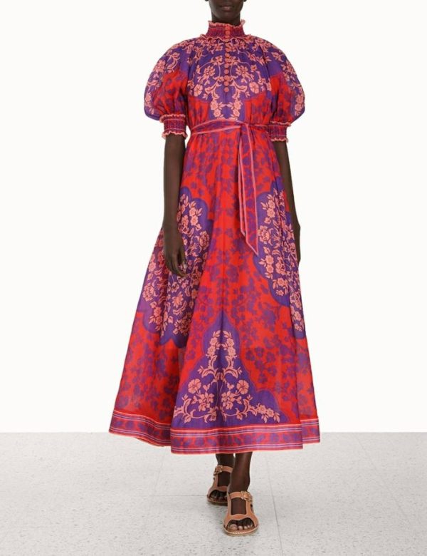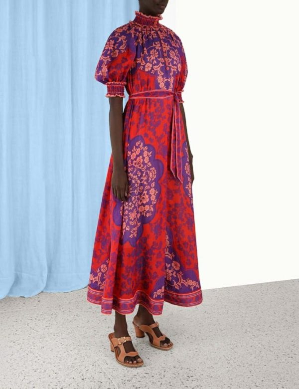 The Raie Swing Maxi Dress in Purple/Red Floral from our Summer Swim 2023 Collection. A ramie maxi dress featuring a relaxed swing silhouette and short blouson sleeves.