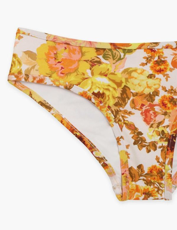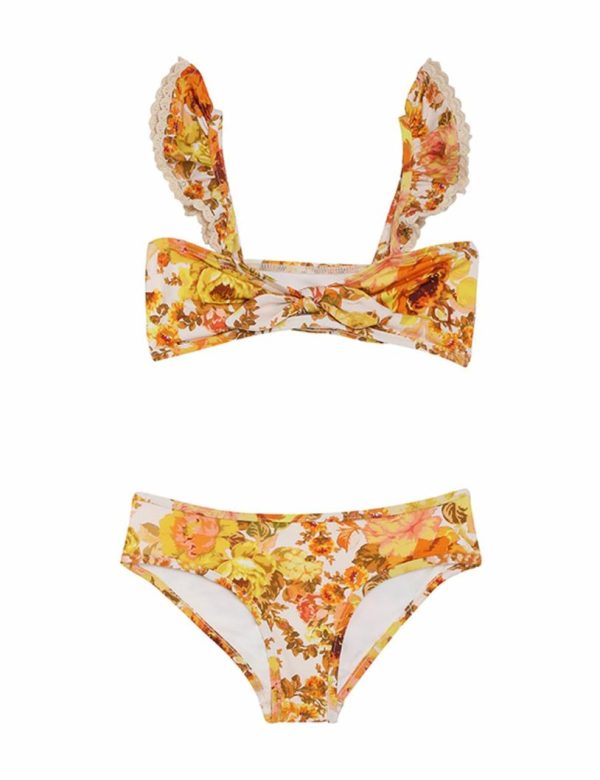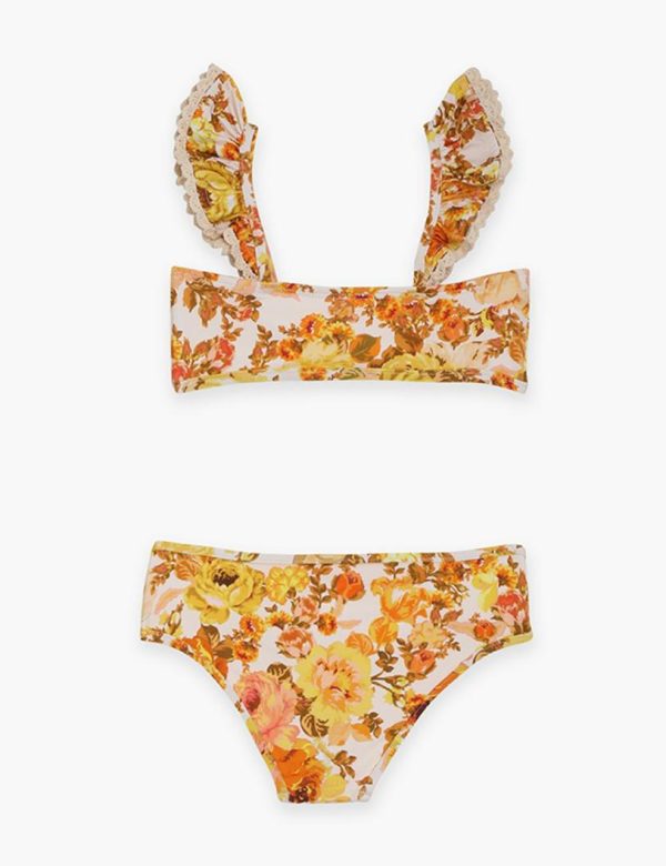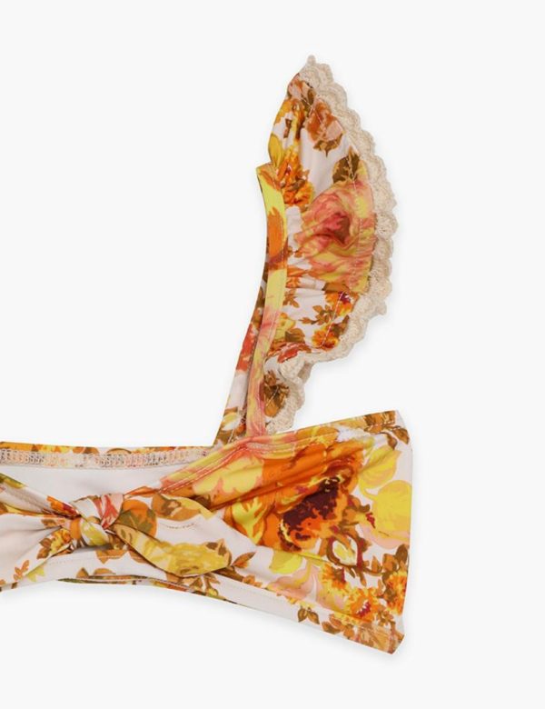 The Raie Trim Tie Front Bikini in Yellow/Orange Floral from our Summer Swim 2023 Collection. A kids lycra bikini set featuring a bow tie at the centre front and frills at the shoulder.