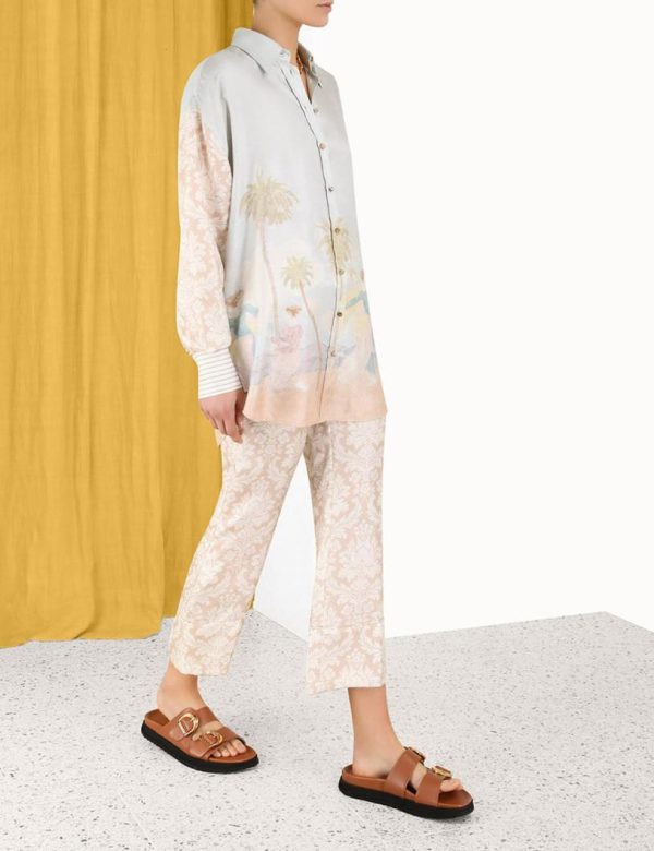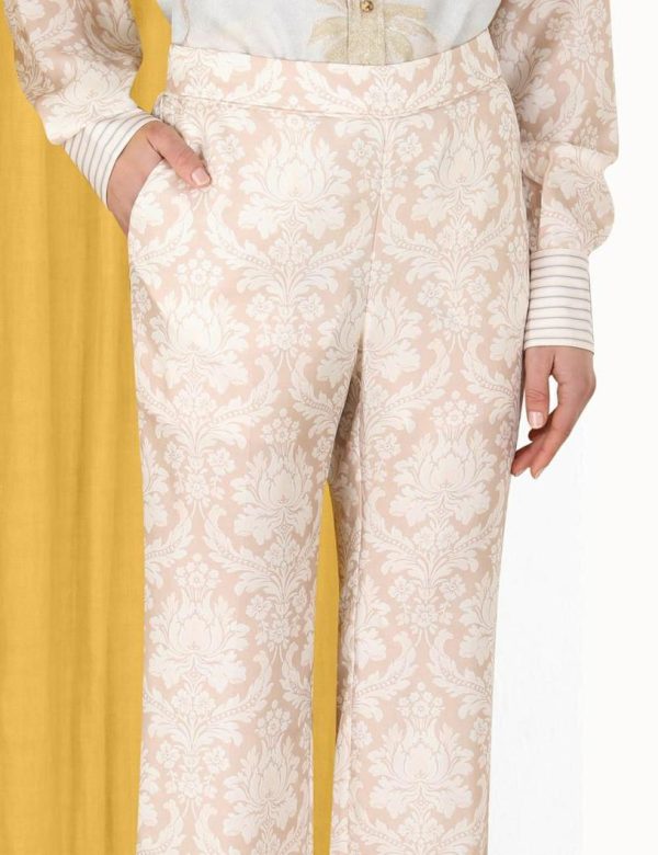 The Sensory Kick Flare in Beige Damask from our Fall 2023 Collection, Luminosity. A silk twill pant featuring a damask print and an elasticated back waist.