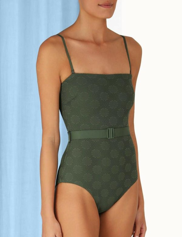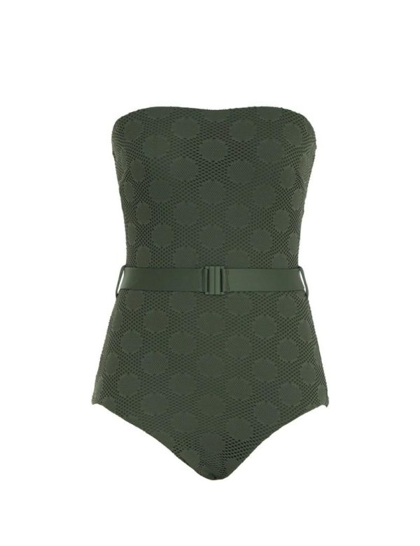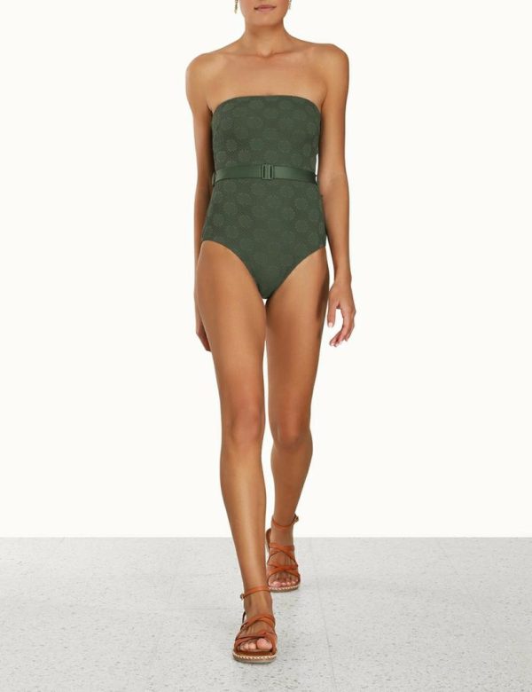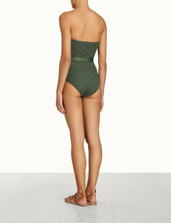 The Separates Dot Bandeau 1PC in Khaki from our Summer Swim 2023 Collection. A strapless one piece constructed from textured Italian lycra featuring an elastic belt with a Zimmermann branded clasp.