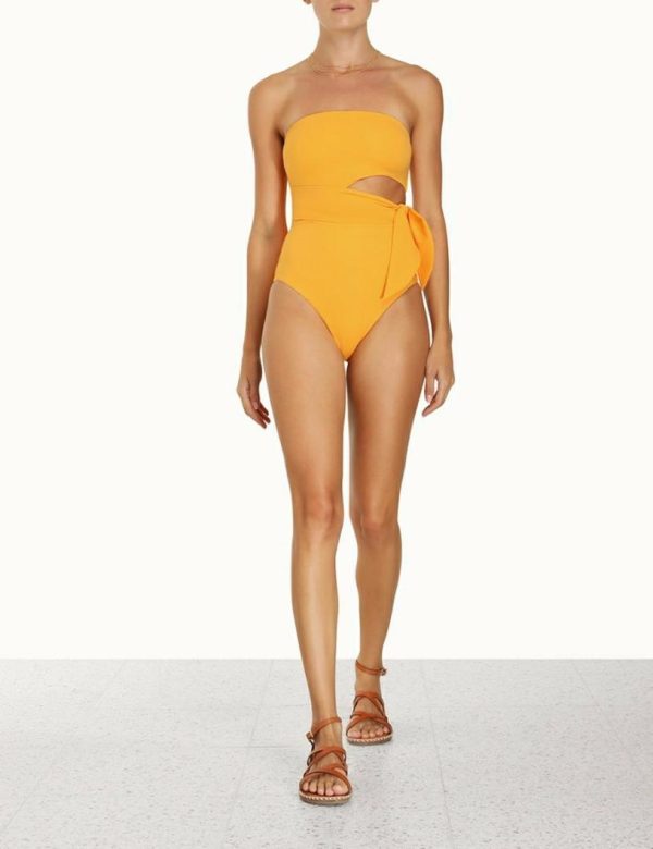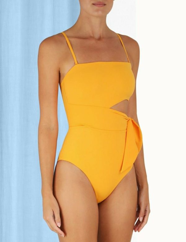 The Separates Sculpt Scarf Tie 1PC in Mustard from our Summer Swim 2023 Collection. A form-fitting Italian lycra one piece featuring a bandeau neckline and scarf tie with a cut out at the waist.