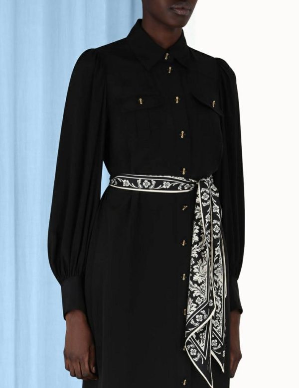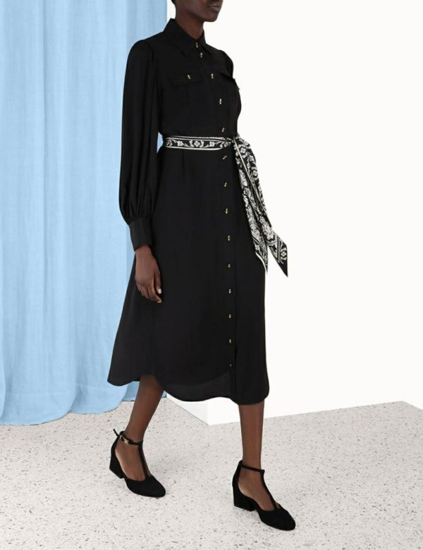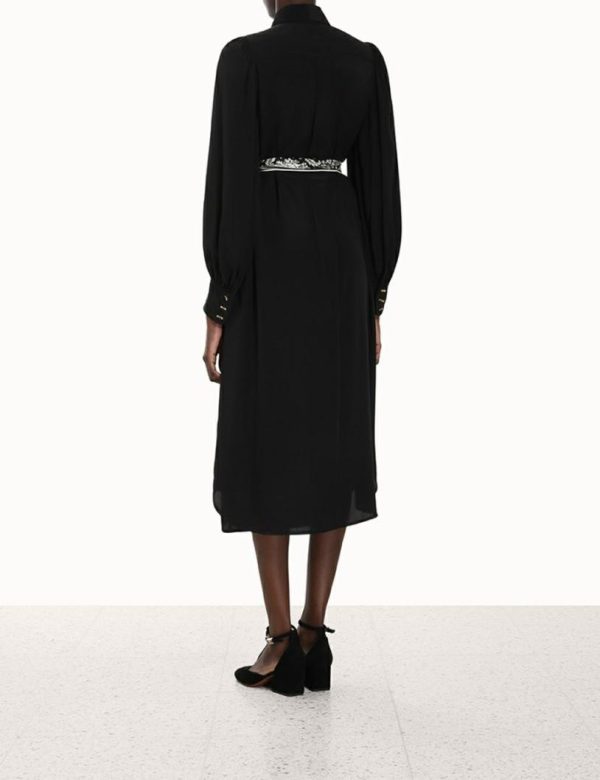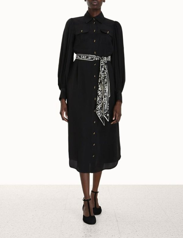 The Shirt Midi Dress in Black from our Fall 2023 Collection, Luminosity. A shirt style midi dress featuring blouson sleeves and contrast binding throughout.