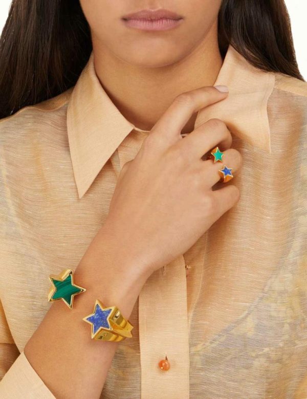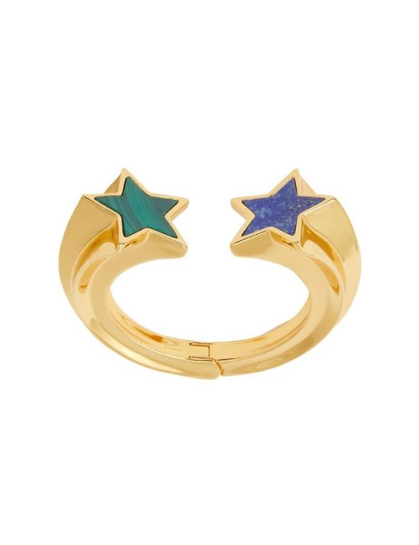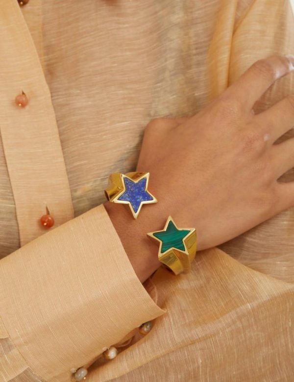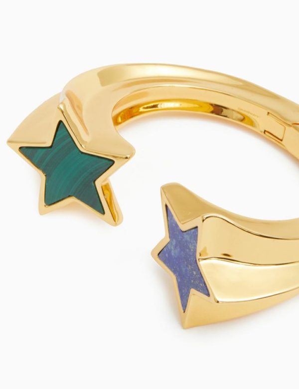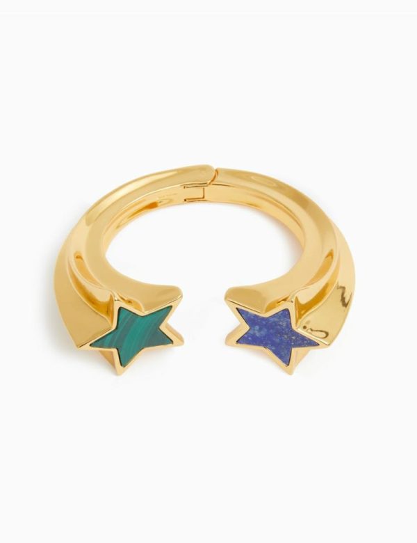 The Shooting Star Fireworks Cuff in Multi from our Spring 2023 Collection, Wonderland. A gold plated wrist cuff featuring semi-precious stones in a star bezel setting.