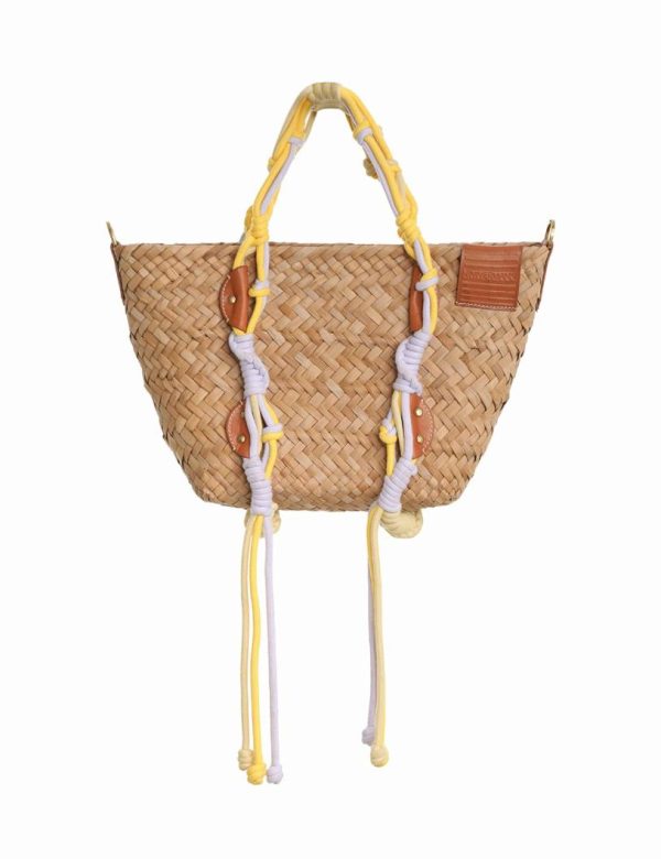 This item is made from natural straw which is handwoven in a loose cross hatch weave. When carrying excessive loads, it is recommended to use the macrame handles. It is recommended to avoid direct and prolonged exposure to the sun, as this may cause damage to the vegetal material. Spot clean with a damp cloth. Do not use chemical