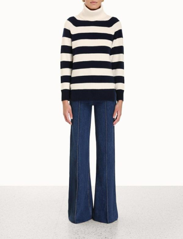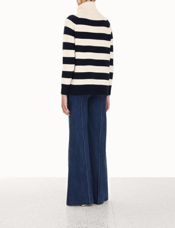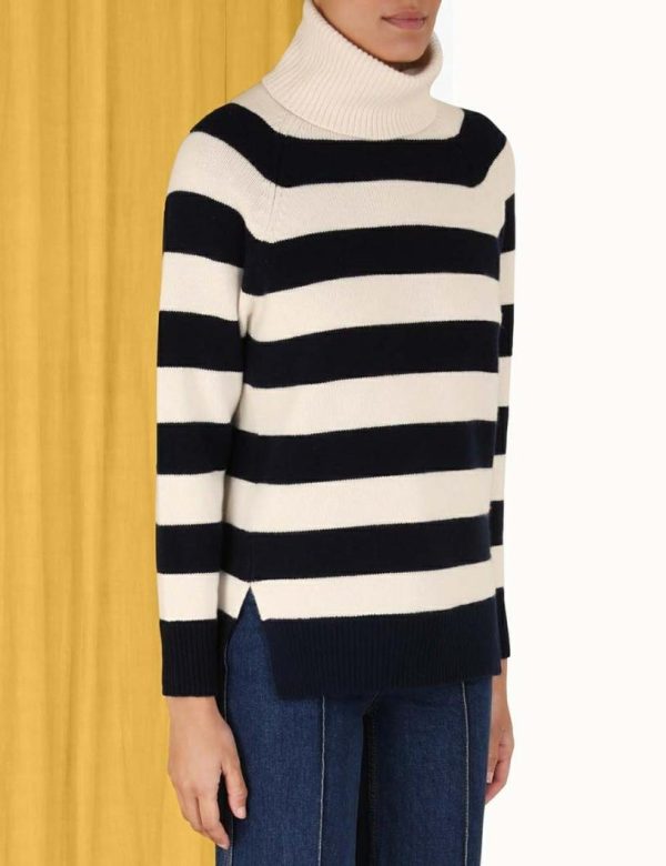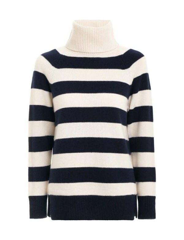 The Striped Roll Neck Sweater in Cream/Navy from our Fall 2023 Collection, Luminosity. A wool blend sweater featuring a thick roll neck and ribbed edges throughout.