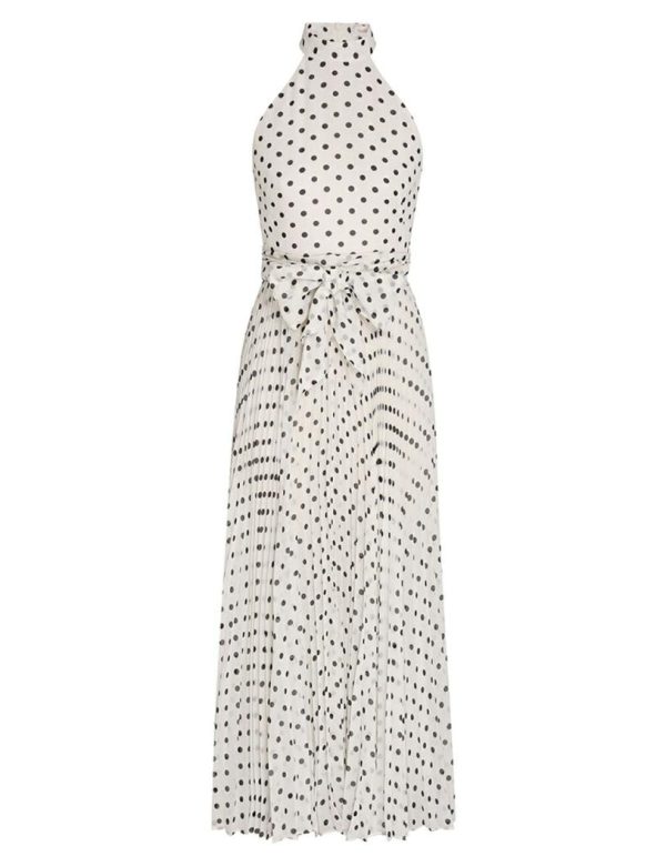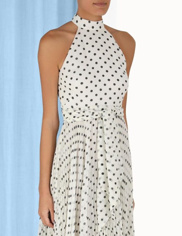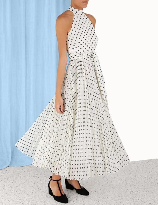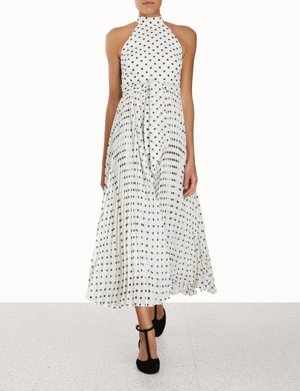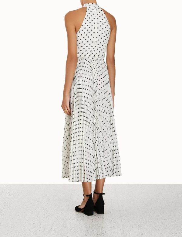 The Sunray Picnic Dress in Cream/Black Dot from our Fall 2023 Collection, Luminosity. A high neck midi dress with a pleated skirt and belted waist.