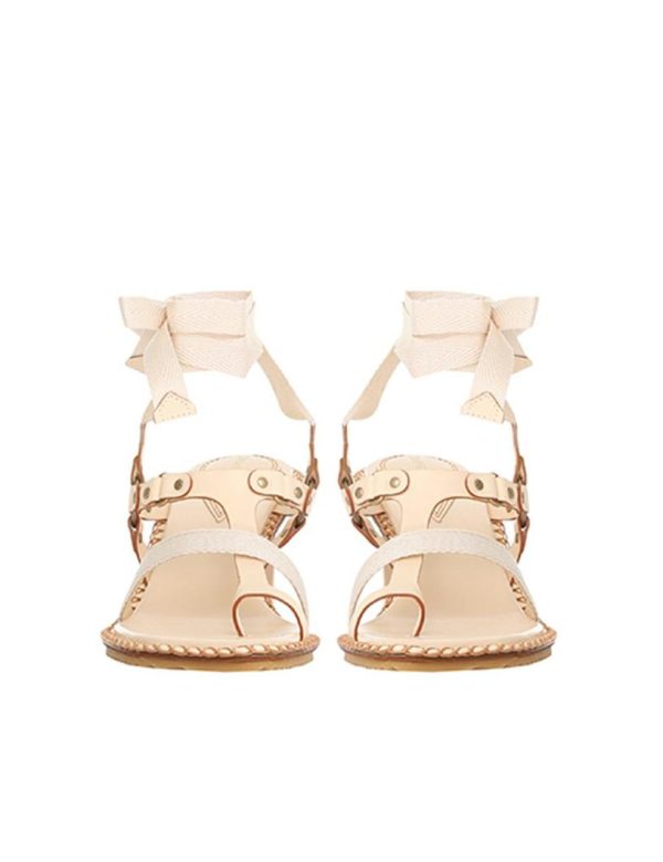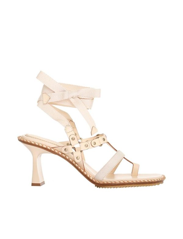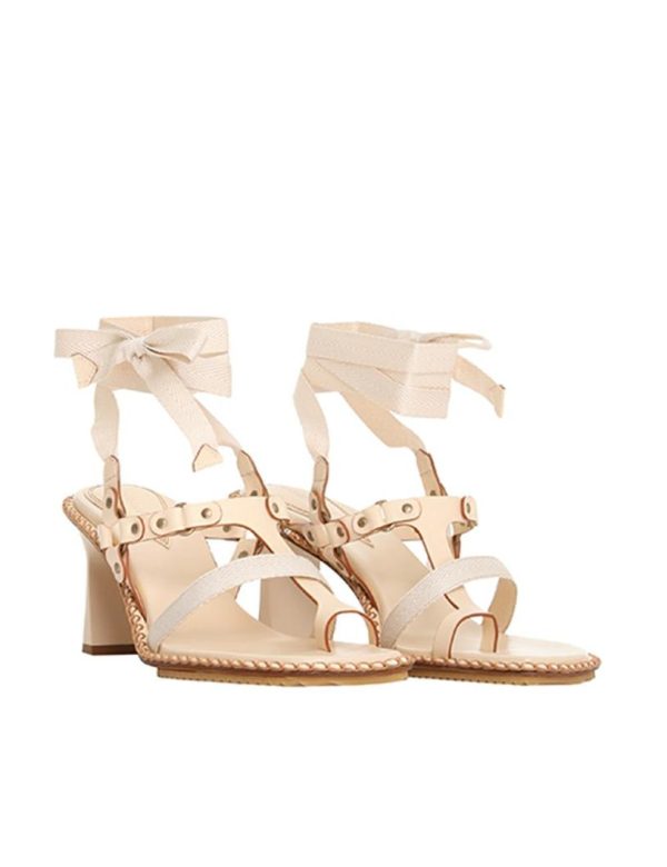 The Toe Thong Bow Sandal 65 in Desert from our Summer Swim 2023 Collection. A leather heeled sandal featuring a lace up ankle and gold hardware throughout.