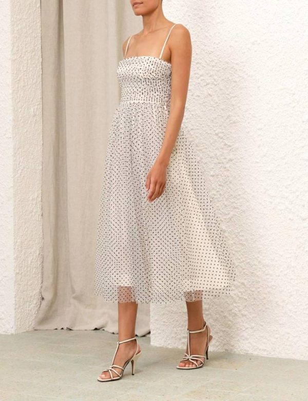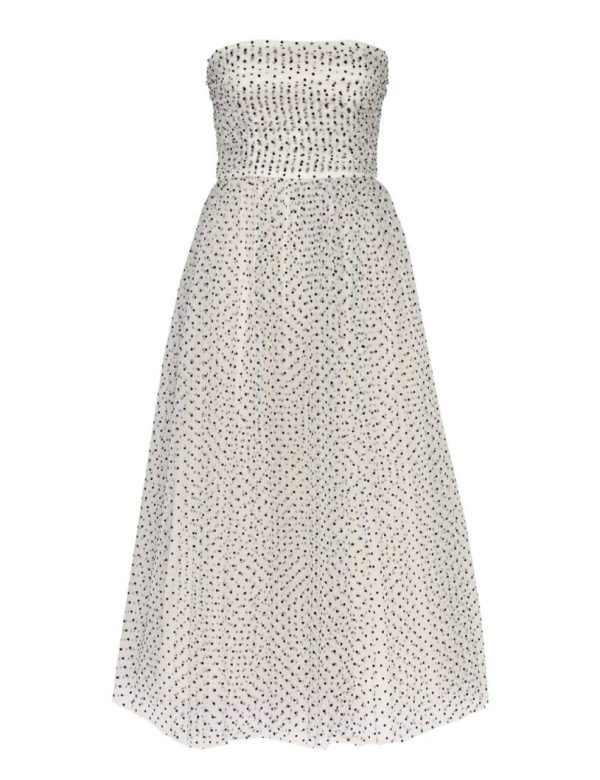 The Tulle Midi Dress in Cream/Black Dot from our Resort 2024 Collection, Matchmaker. A strapless midi dress featuring flocked tulle, bonding at the side seams and side seam pockets.