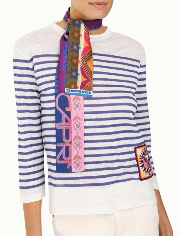 The Ribbon Scarf in Capri from our Holiday 2023 Edit. A silk rectangular scarf featuring a customised placement print throughout.