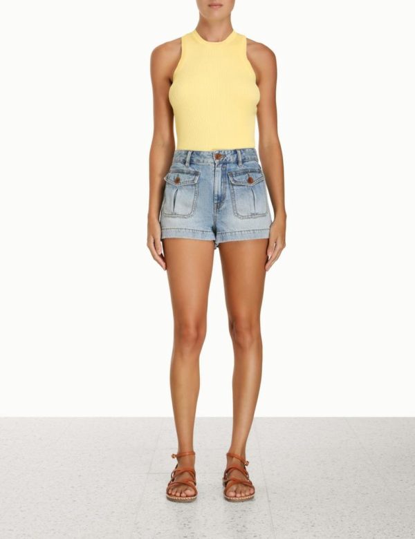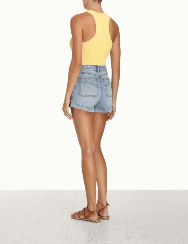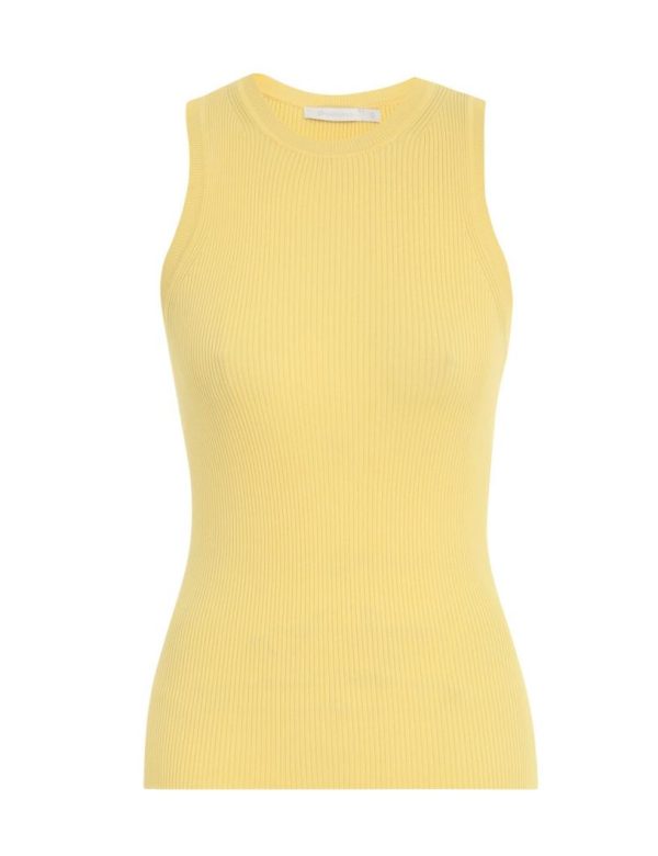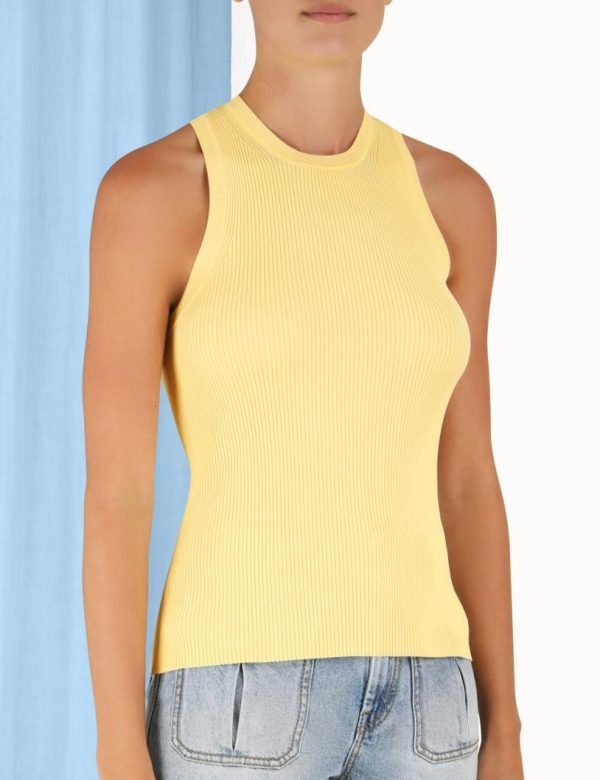The Vacay Knit Racer Tank in Lemon from our Summer Swim 2023 Collection. A ribbed knit, fitted tank with a racerback silhouette.