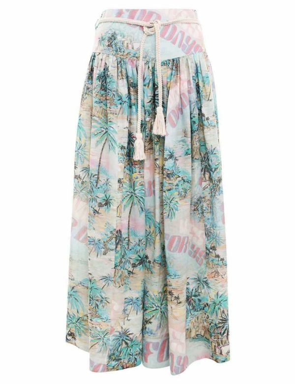 The Vacay Midi Skirt in Blue Multi from our Summer Swim 2023 Collection. A linen midi skirt featuring a basque waist and rope belt with fringed tassel ends.