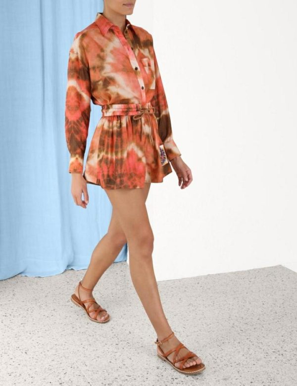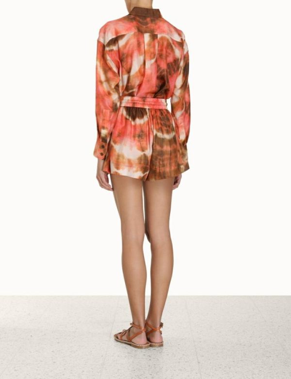 The Vacay Relaxed Short in Red/Brown Tie Dye from our Summer Swim 2023 Collection. A silk printed short featuring pockets, an elasticated waistband and a self tie waist.