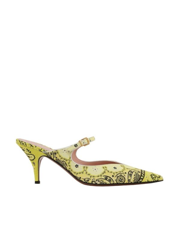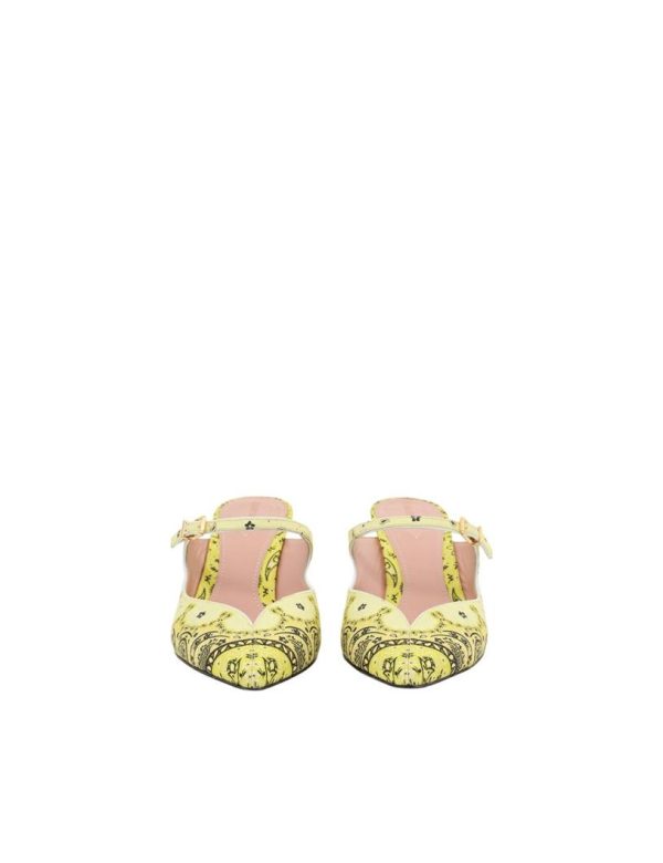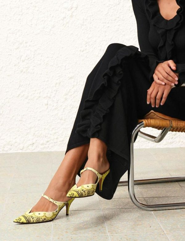 The Aura Mule 65 in Yellow Bandana from our Resort 2024 Collection, Matchmaker. A leather stiletto mule featuring a linen print throughout.