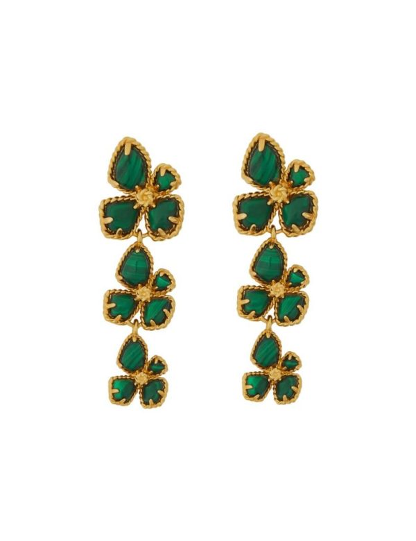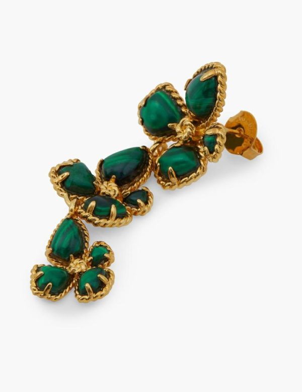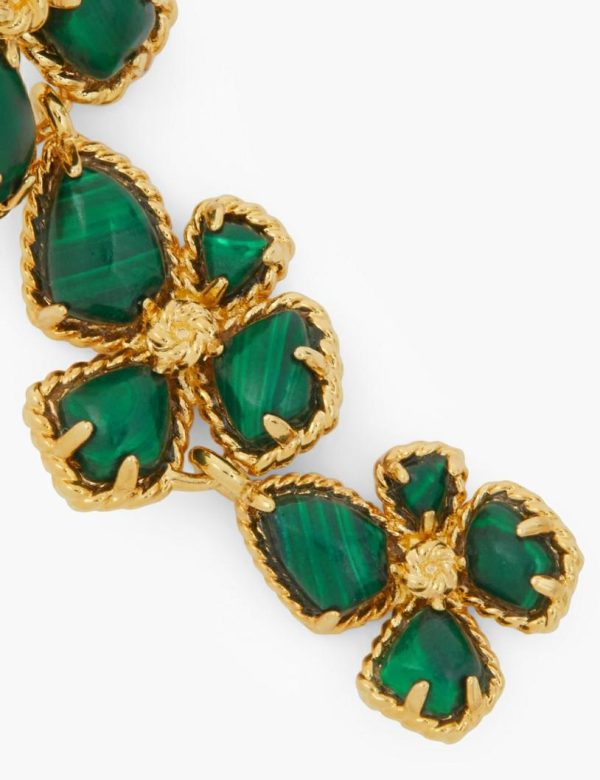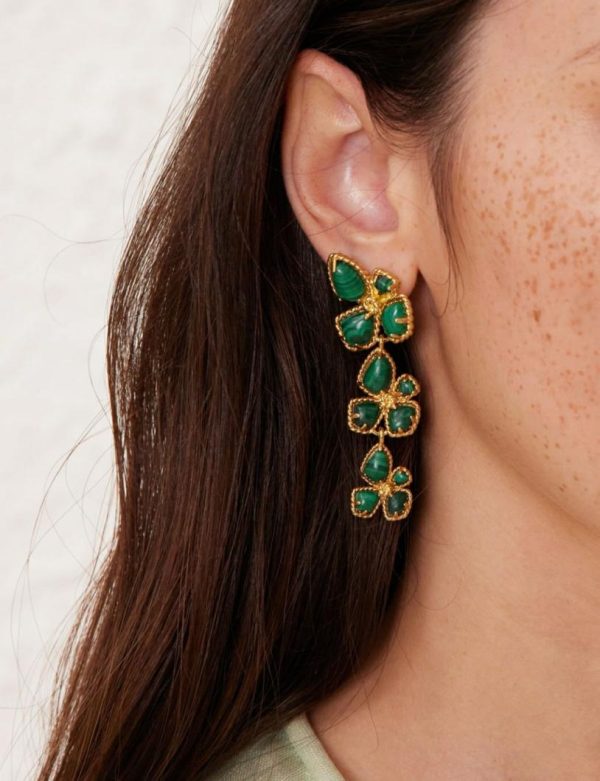 The Zimmermann Bloom Large Dangles in Gold/Malachite from our Resort 2024 Collection, Matchmaker. A gold plated drop earring featuring semi precious and cubic zirconia stones throughout.