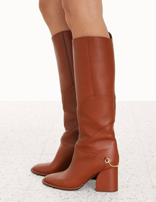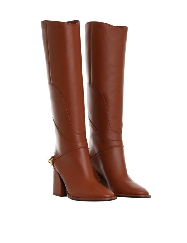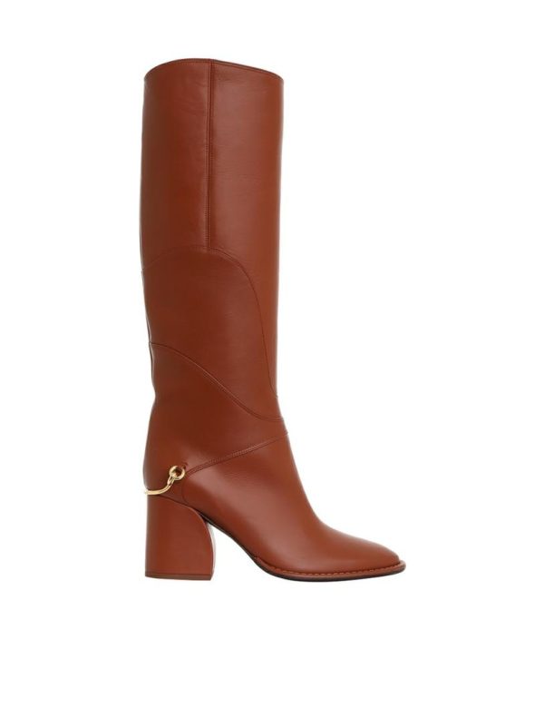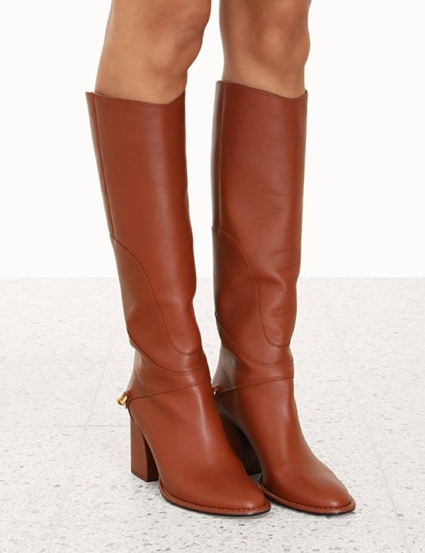 The Zimmermann Gallop Boots 75 in Tan from our Fall 2023 Collection, Luminosity. A leather long boot featuring topstitching throughout and custom engraved stirrup hardware.