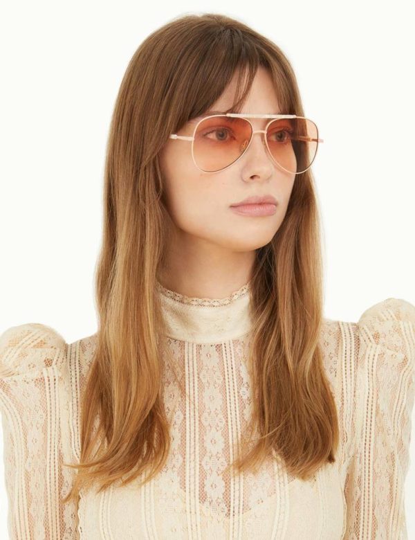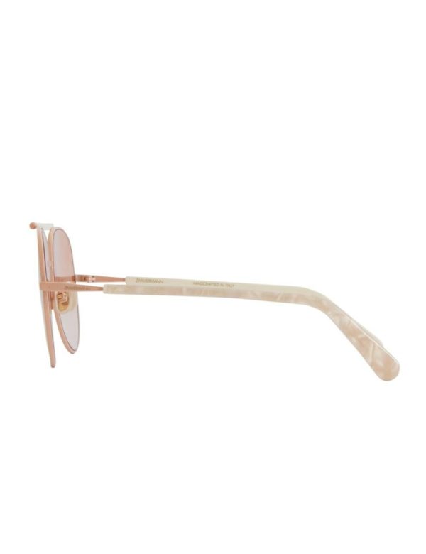The Zimmermann Prima Aviator in Rose Pearl from our Spring 2023 Collection, Wonderland. An aviator style frame featuring a fractured pearl brow bar and an enamel painted metal frame.